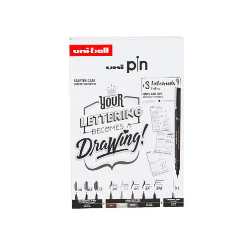 Tűfilc és ecsetfilc készlet - UNI PIN Lettering 9 db-os készlet - fekete tűfilcek plusz ecsetfilcek: fekete, szépia, világosszürke és sötétszürke, mechanikus ceruzával