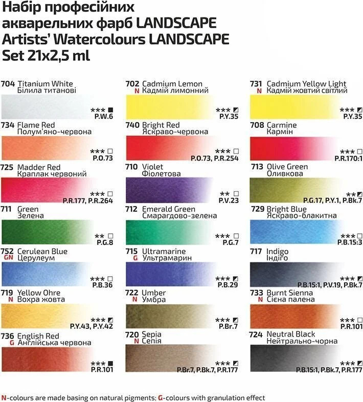A pigmentek vegyesek: organikusak és mesterséges pigmentek is találhatók a festékekben, lásd a színtáblázatot a képek között. A többségébn egyetlen fajta pigmentet tartalmazó színek miatt alkalmas a készlet az egymást követő átlátszó rétegek kialakítására. A színek tökéletesen keverhetők.